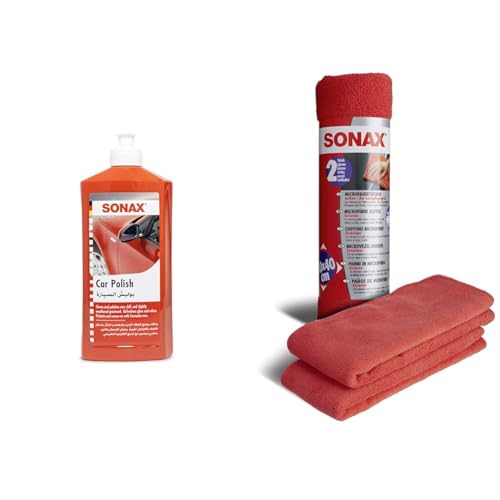 Sonax 300200 Bilpolish, 500 ml & Sonax 1837641 Mikrofiberdukar, 2 Stycken, Röd