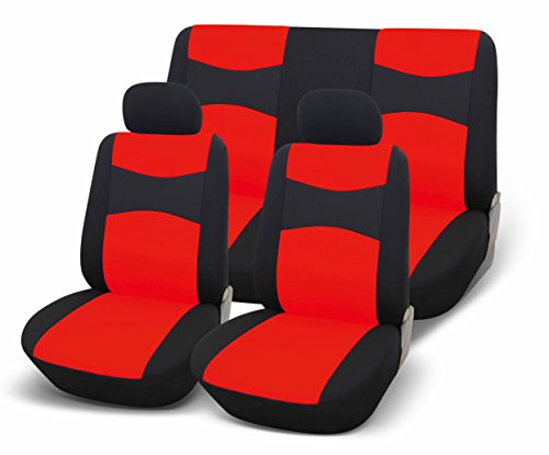 FH Group Bilsätesöverdrag röd universell passform unik platt duk passar de flesta bilar, SUV:er och lastbilar (med 4 avtagbara nackstöd och solid bänk) FB032RED114