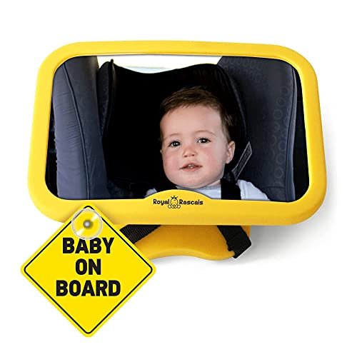 Royal Rascals Baby bilspegel, säkraste splittersäkra baksätesspegel för bil, kristallklar backspegel för baby, baby bilsätesspegel, bilstolstillbehör, levereras med en skylt, säkerhetsgul