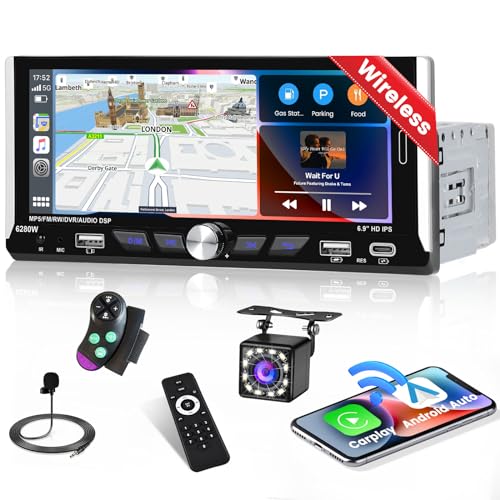 Inefala 1 DIN Bilradio med trådlös Carplay och Android Auto, 6.9” Pekskärm, Bluetooth, Mirror Link, Bilstereo med FM Radio SWC Backkamera USB och Typ-C Port