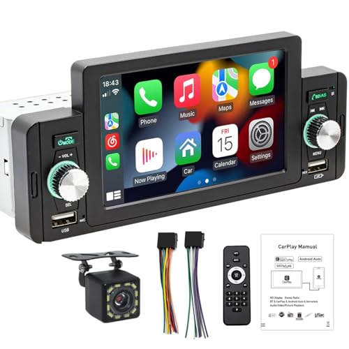 VIGORTHERIVE Bilstereo Carplay 5-tums Bluetooth-handsfreesamtal Carplay Android auto Pekskärmsspegellänk AM/FM/3USB/SD med 12LED-backkamera 1Din