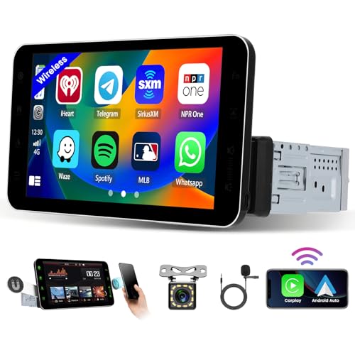 Hikity 9 tums bilstereo, 1 Din med trådlös CarPlay, Android Auto, pekskärm bilradio, med telefonhållare, bil bluetooth radiostation med FM, USB, SWC och backkamera