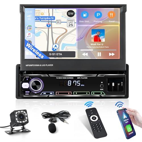 Inefala Autoradio 1 Din Carplay Trådlös Infällbar Skärm med Android Auto, 7 Tums Pekskärm Stereo Bilstereo Stödjer Bluetooth/Mirror Link/FM/USB EQ DAB med Backkamera
