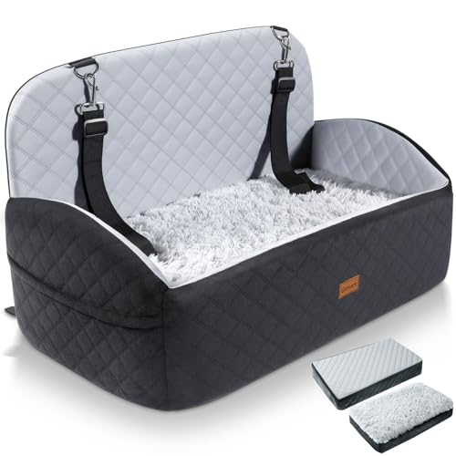 Gimars Vändbar Hund Bilstol Med Lång/Kort Plysch Sittdyna För Små/Medelstora Hundar Upp till 27kg, Avtagbar Tvättbar Halkfri Hund Booster Säte Med 13cm 28D-Egg-crate Skum, Säkerhetsbälte, L