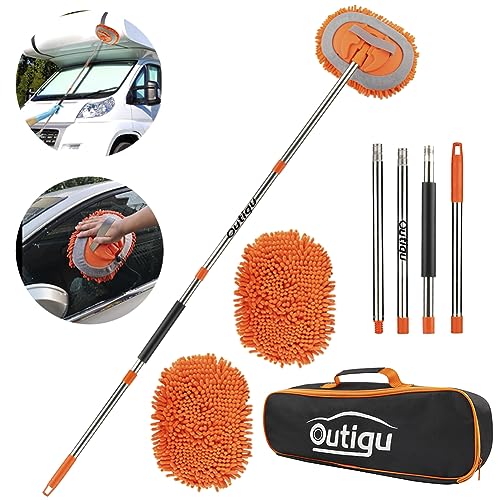 GreatCool 160 cm biltvättborste tvättborste bil med långt handtag, 2 i 1 orange mikrofiber chenille biltvättmopp tvätthandske rengöringsborste för bil husbil lastbilar husvagn husbil (2 x mopphuvud)