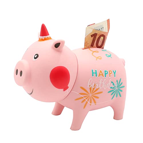 Dekohelden24 Spargris med motiv: Happy Birthday, material: Vinyl/rosa/rosa, mått L/B/H: 16 x 9 x 13 cm