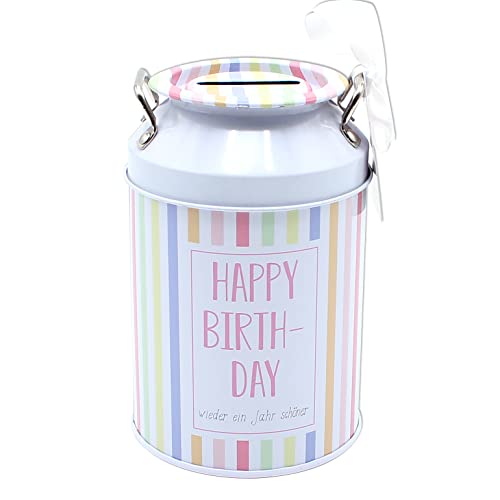 Dekohelden24 Metall sparbössa – mjölkkanna – motiv: Happy Birthday, med ordspråk, mått L/B/H: ca 12 x 8 x 12 cm