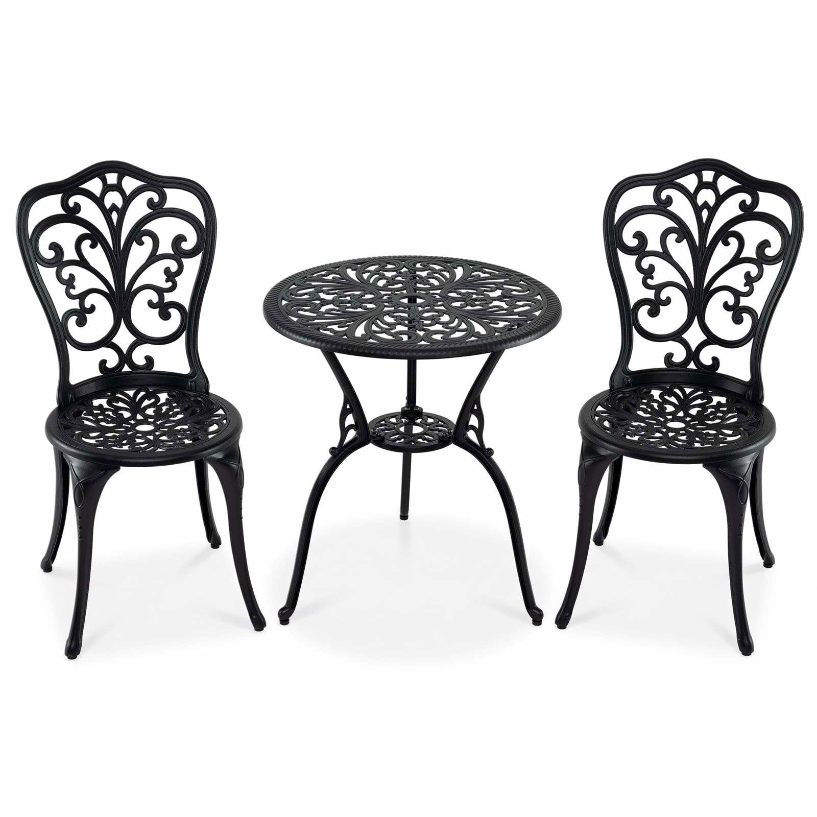 3-delad antik gjuten aluminium bistroset balkongset sittgrupp trädgårdsbord med 2 stolar svart