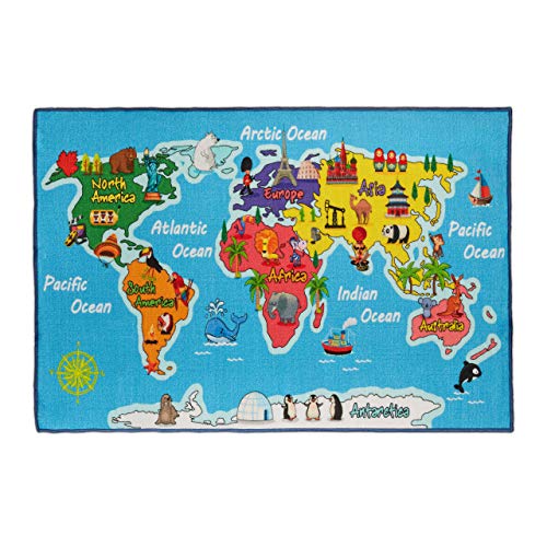 Relaxdays Barnmatta världskarta, 150 x 100 cm lekmatta, kort lugg, halkfri beläggning, djur och hav, blå, 1 st