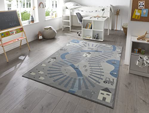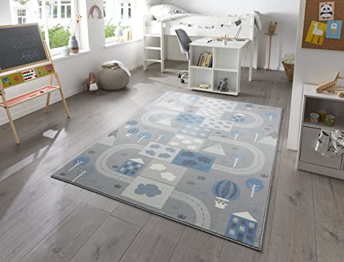 Hanse Home barnmatta lekmatta Dream Street (80 x 150 cm, 100% polypropylen, slitstark och lätt att rengöra, ringformad kandelad, golvmattning), grå blå