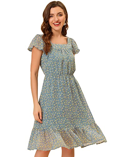 Allegra K Blommig chiffong fladdrande ärm bälte fyrkantig hals volang fåll klänning, Blå grå, L