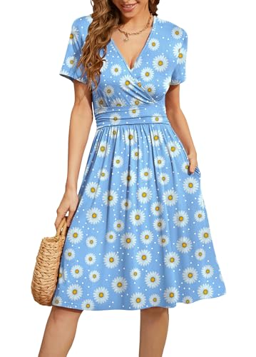 WEACZZY Kortärmad klänning med vardaglig passform för damer, sommarklänning, v-ringad blommig festklänning med fickor, Daisy blå, L