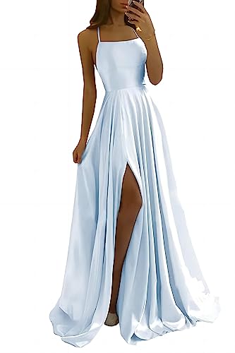 xxxiticat Eleganta långa balklänningar för kvinnor, satin, A-linje, bröllopsklänning, aftonklänningar, sexig halterneck, spaghetti, brudklänning, lång, prinsessa, brudtärneklänning, Ljusblå, XS