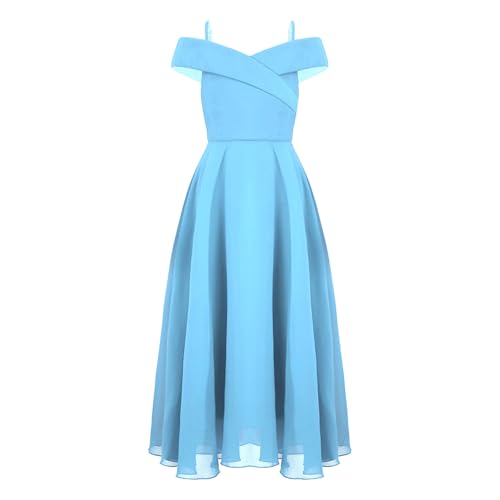 Freebily Bröllopsklänning för flickor lång elegant aftonklänning brud prinsessa bröllop brud födelsedag chiffong bröllop ärmlös en axel boll guwn, Blå himmel, 13-14 anni