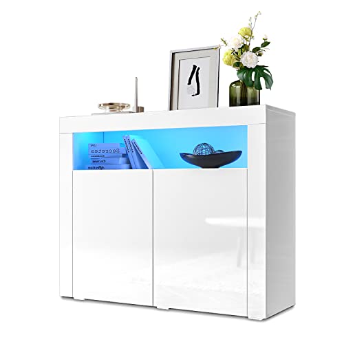 SONNI Byrå vit högglans med LED-belysning, skänk vit med 2 dörrar 120 cm bred