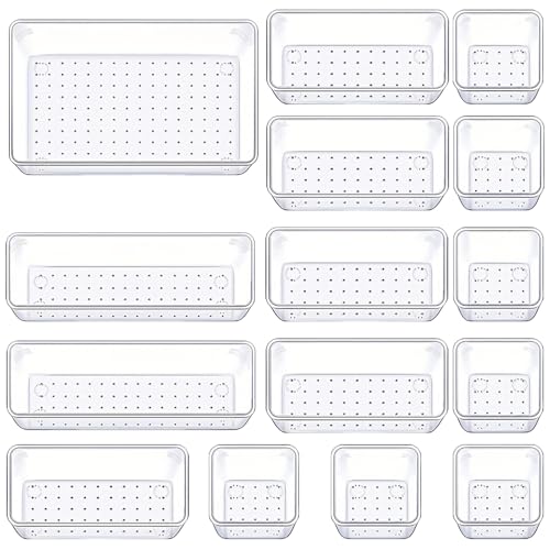 Manalete Lådorganisatörer, set med 15, 4 storlekar, genomskinliga plastlådorganisatörer och förvaringskorgar för kök, badrum, kontor, byrå, skrivbordslåda, organiseringsbricka för smycken, smink