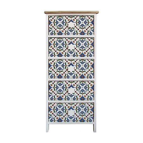 Rebecca Mobili Utrymmesbesparande byrå, badrumsskåp 5 lådor, ljusblått vitt trä, majolikatryck, för vardagsrum - Mått: 93 x 40 x 30 cm (HxBxD) - Art. RE6498