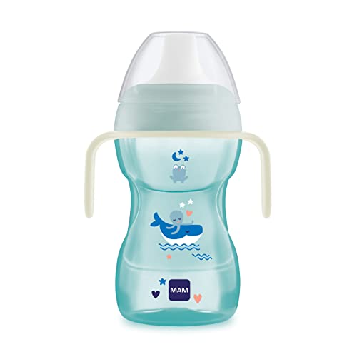 MAM Rolig att dricka kopp och glöd handtag, babyflaska med handtag, spillfri sippy kopp, övergångsflaska flaska för spädbarn och småbarn, blå