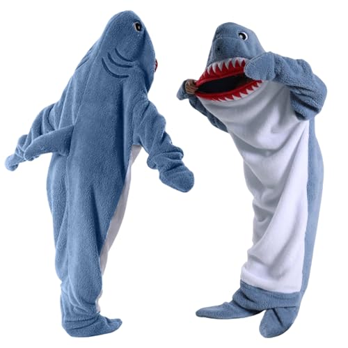 Hajfilt med ärmar, hajfilt flanell med huva, hajfiltar huvtröja, blå haj sovsäck med fötter, hajkostym, present för tecknade pyjamasfester, bärbar filt för vuxna och barn, Gråblå, L(Geeignete