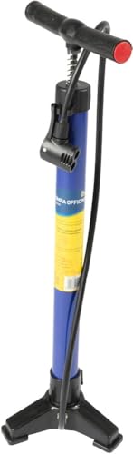 On Bike Blå metallrörformig cykelverkstadspump med T-handtag, tre fötter, snabbinflationsventiler Presta, Schrader och Dunlop - Solid och professionell
