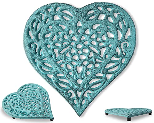 Gjutjärnshjärta grytunderlägg – Dekorativt gjutjärnsgrytunderlägg för kök eller matbord – vintage, rostig design – 6,75 x 6,12,7 cm – med gummipinnar/fötter – återvunnen metall – blå