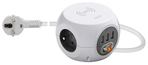 VIMAR 00445.FR.CC.B Multiple uttag med trådlös induktiv laddare, 3 SICURY-utgångar, 3 USB, ljusbrytare, 1,5 m kabel, tyska/franska standardkontakt, vit
