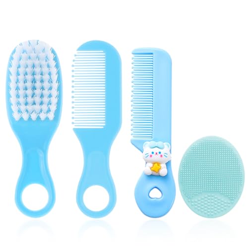 Set med 4 babyhårborstar, massageborste, kamset, silikonvårdborste, babykam, mjuk hårborste för barn och nyfödda (blå)