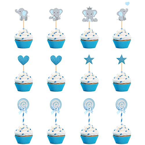 JKJF 50 stycken elefantcupcake-topperset pojke baby shower tårtdekoration elefanter cupcake plektrum kärlek stjärnor klubba tårtdekoration för ett kön reveal party baby dusch barnfödelsedag – blå