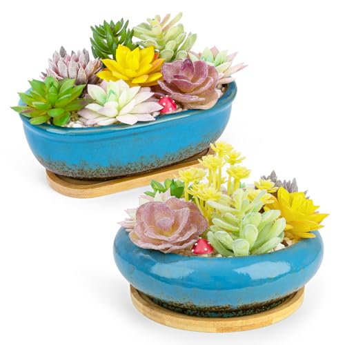 ARTKETTY Suckulenta krukor, keramiska suckulenter, krukor med dräneringsbambubricka, 1 rektangel blomkruka + 1 rund blomkruka för inomhus kaktus bonsai växter hem (blå)