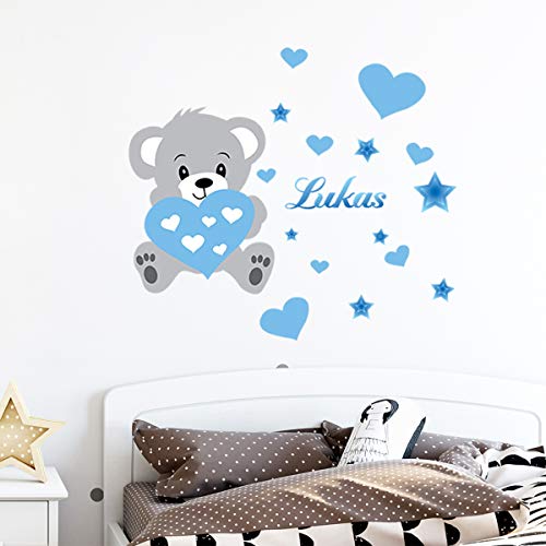 Personligt förnamn klistermärken | Klistermärke Puh klistermärke - väggdekoration för barn | 2 ark 30 x 35 cm och 50 x 30 cm - blå nyans