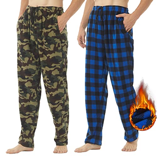 YUSHOW 2-pack fleece pyjamasbyxor för män ultramjuka rutiga loungebyxor med fickor pyjamas myskläder pyjamasbyxor, Blå svart rutig+kamofrön, M