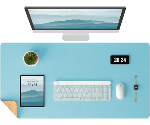 Aothia Skrivbordsunderlägg i kork och läder, dubbelsidig skrivbordsunderlägg i naturlig kork och PU-läder, musmatta, skrivbordsskydd, vattentät för kontor/hem (blå topas, 96 x 43 cm)