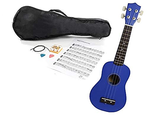 ADM Sopran ukulele set för barn och nybörjare, ukulele startkit med väska, clip-on tuner, regnbågssträngar, färgglada remmar, plektrum greppbrädesklistermärken, ackordkort (blå)