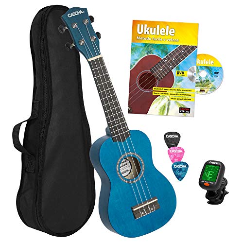 CASCHA Sopran ukulele set för barn och vuxna I ukulele startkit med 3 plektrum väska lärobok pedagogiska videor om QR-kod stämapparat I set Aquila strängar nylon I liten Hawaii gitarr I blå