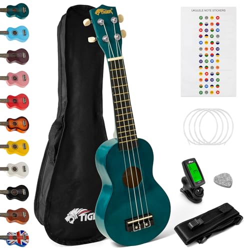 TIGER UKEKIT-TB sopran ukulele för nybörjare inkluderar spelväska, filtplockning, reservuppsättning strängar nu utrustade med Aquila strängar – blågrön blå