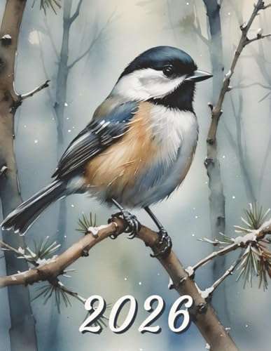 2026: Large Monthly Calendar Planner – Watercolor Black-capped Chickadee Bird