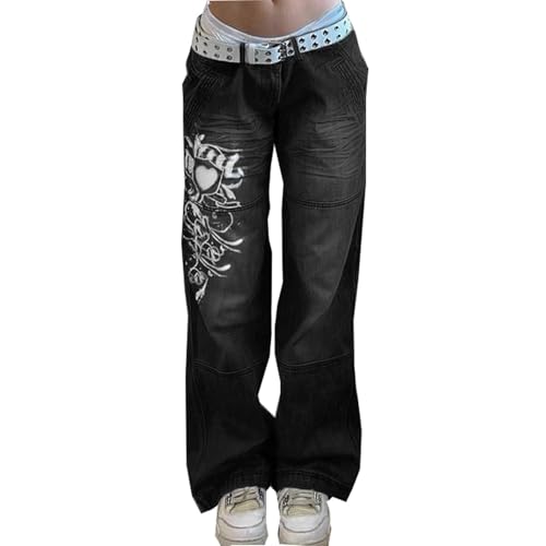 Dam Jeans Med Vida Ben Med Låg Midja Vintagetryck Baggy Byxor Y2k Distressed Raka Jeansbyxor Slim Flare Jean E Girl Streetwear (Color : Black, Size : S)