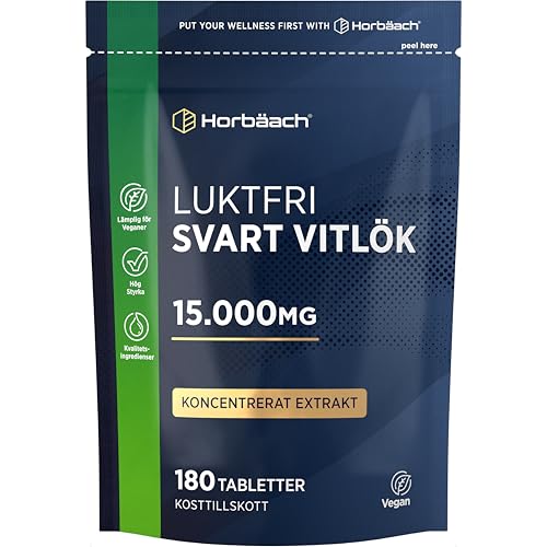 Svart Vitlök Fermenterad 15000mg | 180 Veganska Tabletter | Kosttillskott Koncentrerat av Vitlöksextrakt | Hög Dos | Luktfri & Smaklös | Aged Black Garlic Supplement | Horbaach