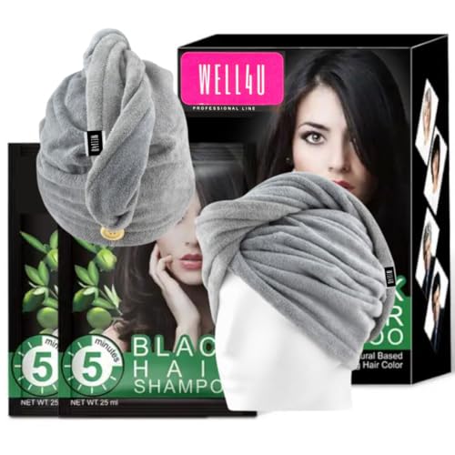 WELL4U - Black Hair Shampoo + meningsfull MF-hår (handduk med knapp), för snabb torkning i en uppsättning – schampo mot grått hår – svart hårschampo för grå täckning av grått hår