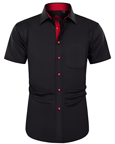 J.VER Linneskjorta för män, långärmad, bomull, casual, strand, Henley T-shirt, bandkrage, semester, T-shirt, med ficka, A-svart/röd, S