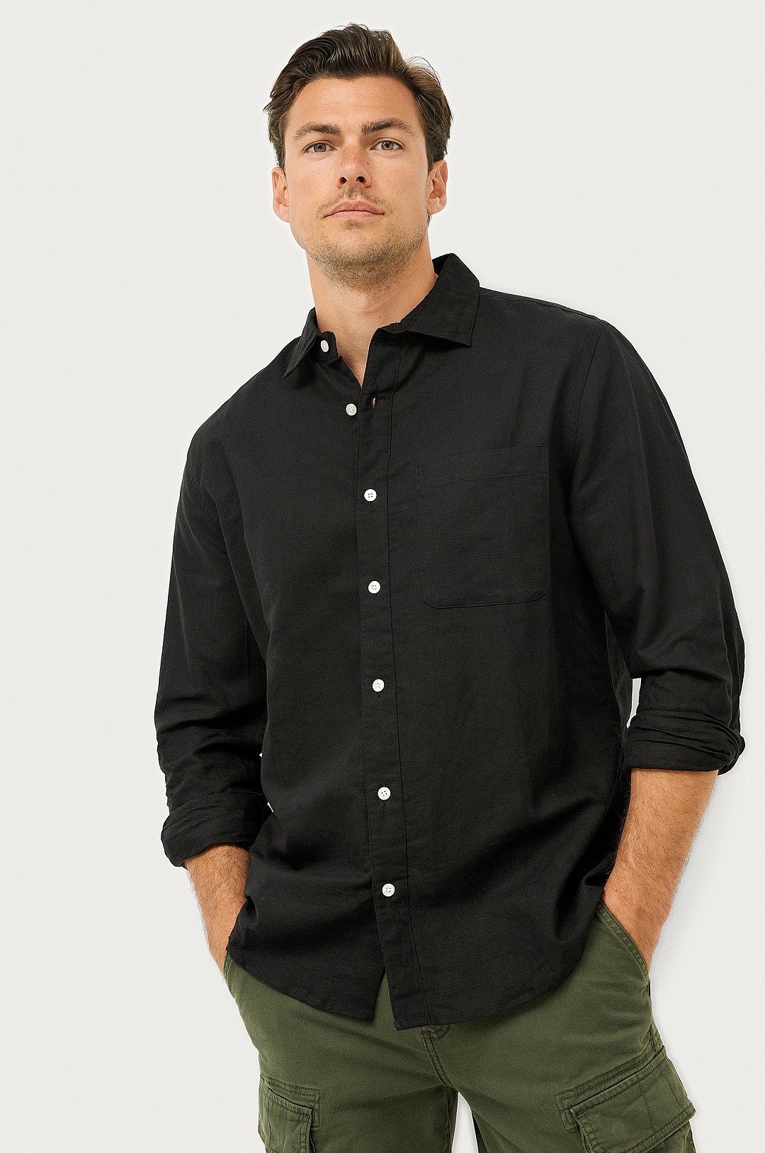 Enlision Linneskjorta, långärmad herrskjorta i bomull, lätt sommarskjorta, fritidsskjorta, normal passform, farfarsskjorta med bröstficka, A- svart, L
