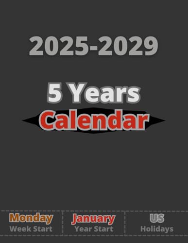 5 Years Calendar Monthly Planner: Year Starting January to December - Week Starting Monday to Sunday - With Holidays - Letter Size 8.5x11" - Elegant Dark Black Cover Design