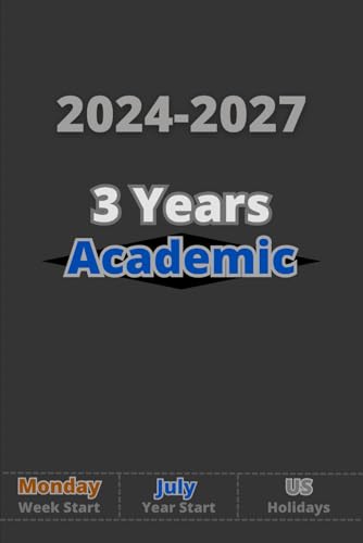 3 Years Academic Calendar Monthly Planner: Year Starting July to June - Week Starting Monday to Sunday - With Holidays - Medium Size 6x9" - Elegant Dark Black Cover Design