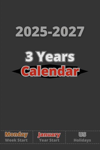 3 Years Calendar Monthly Planner: Year Starting January to December - Week Starting Monday to Sunday - With Holidays - Medium Size 6x9" - Elegant Dark Black Cover Design