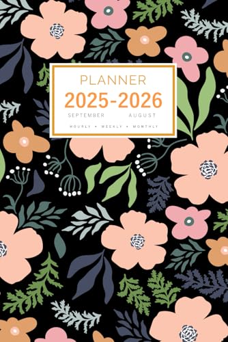 Planner September 2025-2026 August: 6x9 Medium Notebook Organizer with Hourly Time Slots | Pretty Abstract Floral Design Black