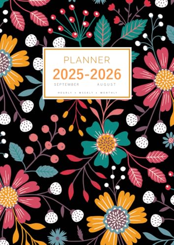 Planner September 2025-2026 August: A4 Large Notebook Organizer with Hourly Time Slots | Colorful Spring Floral Design Black