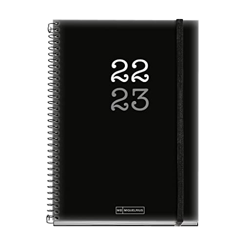 MIQUELRIUS - Agenda september 2022 juni 2023 - Dag Sida - Plus storlek 15 x 21,3 cm - Tvåspråkig: spanska, engelska - College - Svart