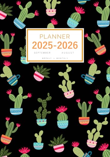 Planner September 2025-2026 August: A5 Weekly and Monthly Organizer | Mexican Cactus Succulent Design Black