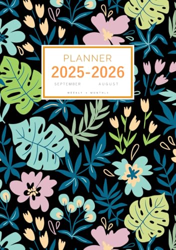 Planner September 2025-2026 August: A5 Weekly and Monthly Organizer | Pastel Tropical Plant Design Black