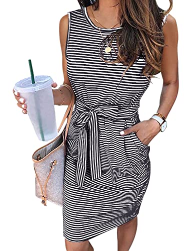 MEROKEETY Womens Summer Sleeveless Striped T Shirt Dress Casual Crew Neck Tie Waist Mini Dresses Black